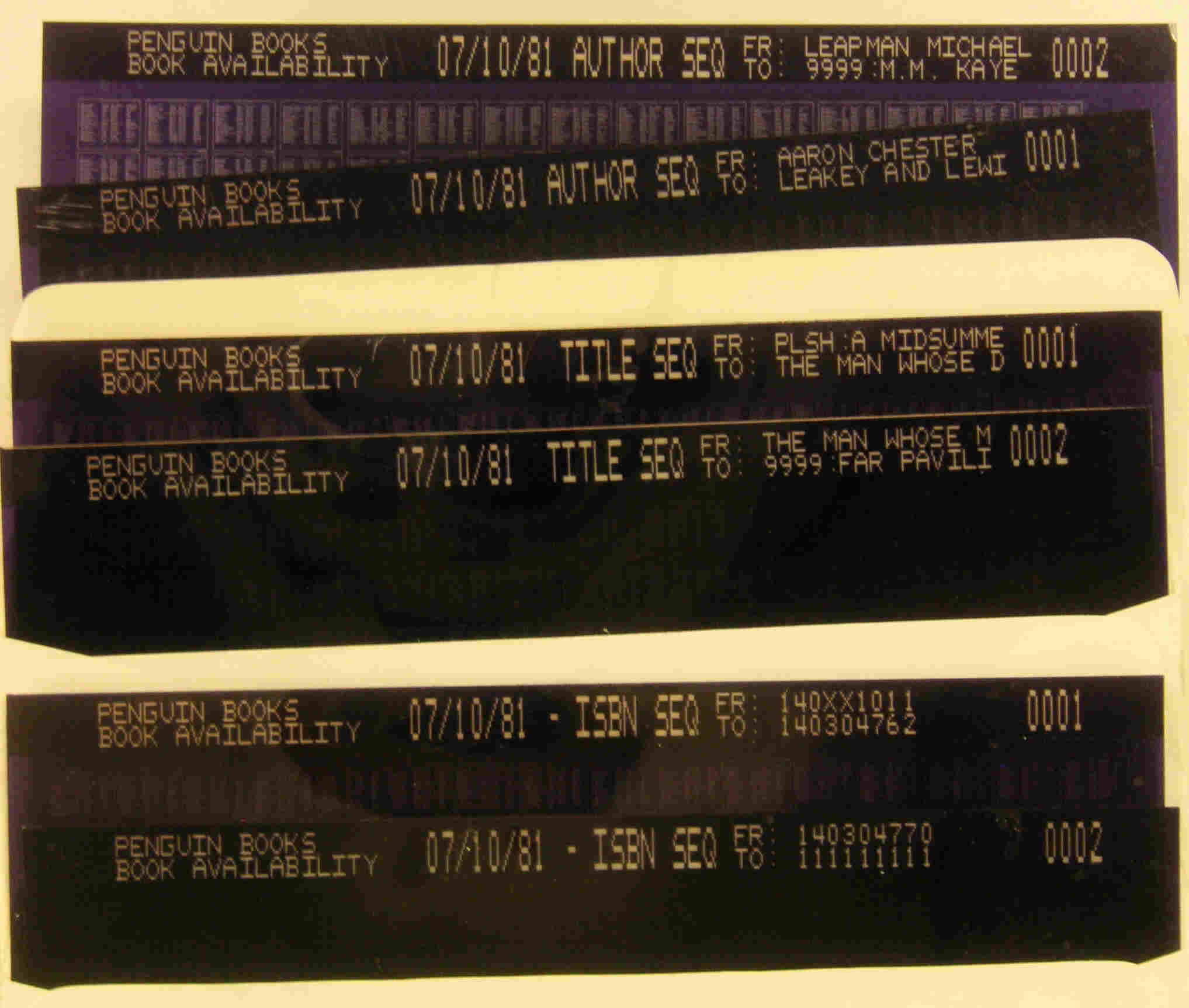 • 2 x Sheets of Microfiche: AUTHOR SEQuence from AARON to LEAKEY, and from LEADMAN to 9999